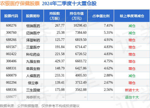 None农银医疗保健股票为股票型基金,字据最新一期基金季报线路,该基金金钱成就:股票占净值比88.32%,无债券类金钱,现款占净值比12.18%。基金十大重仓股如下: