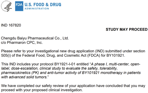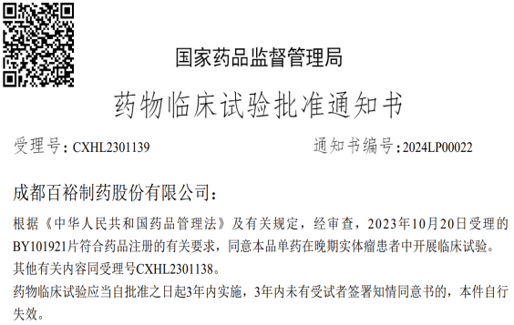 2024年1月初,成都百裕制药自主研发的1.1类新药BY101921 IND申请获中国国家药监局(NMPA)批准;2023年12月初,BY101921已获得美国食品药品监督管理局(FDA)临床试验默认许可。BY101921拟用于多种晚期实体瘤患者的研究与治疗。